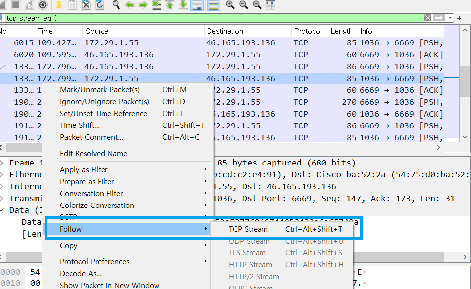 [우클릭 -> Follow -> TCP Stream]을 누르면 아래와 같이 TCP Stream 창의 텍스트들을 볼 수 있습니다.
