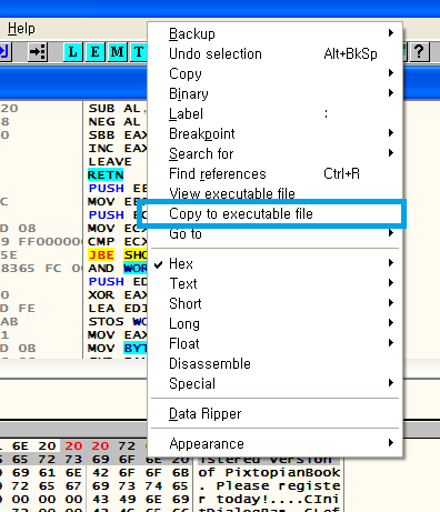 레나 튜토리얼 04번의 핵심은 pixtopianbook 프로그램을 실행했을 시 리버싱 프로그램을 통해 UNREGISTERED VERSION의 문구를 REGISTERED로 바꾸는 것입니다.