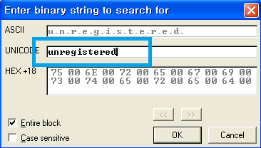 유니코드 텍스트란에 찾고자하는 문구인 'unregistered'를 넣고 OK를 눌러줍니다.