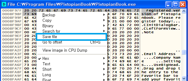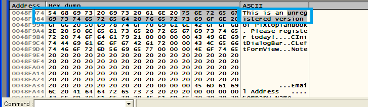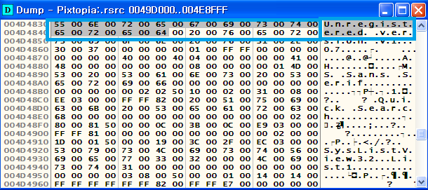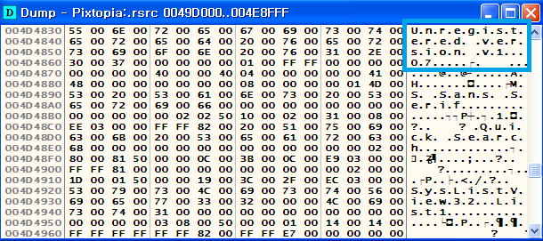 바로 빠르게 돌아가는 검색란들 중 unregistered 문구가 검색이 완료되었다면 다음과 같은 덤프(Dump) 창이 뜰 거고, 검색된 유니코드 unregistered도 보입니다.(아스키코드 U.n.r.e.g.i.s.t.e.r.e.d.)