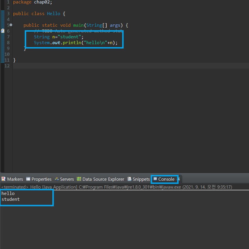 System.out.println("hello\n"+n);