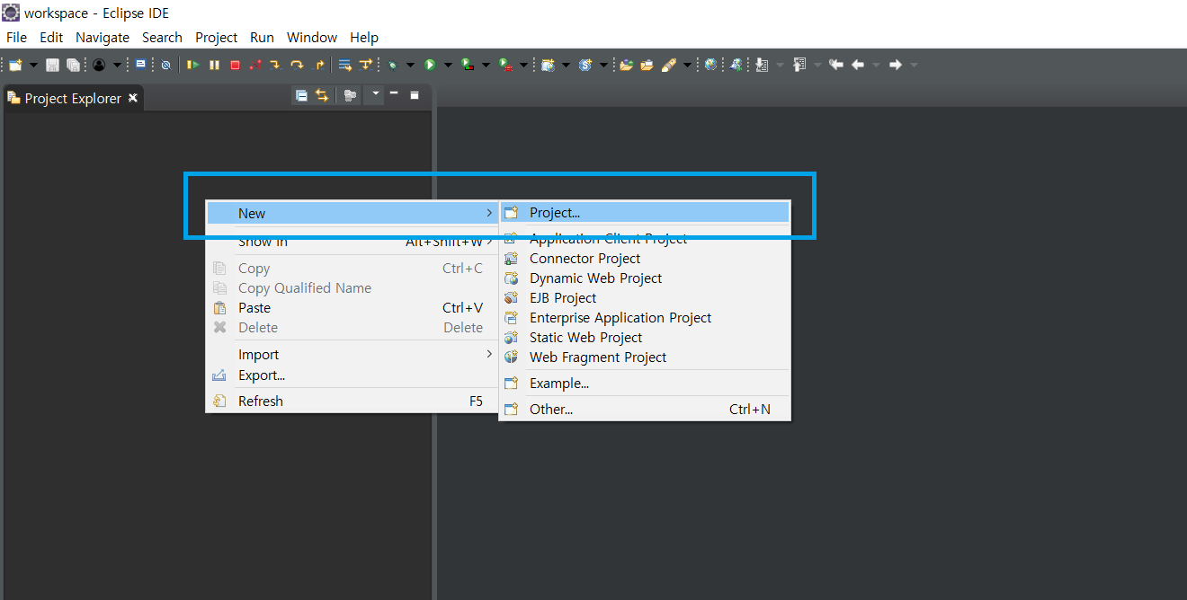이클립스가 설치되었다는 가정 하에, 좌측 Project Explorer란을 우클릭해주신 다음