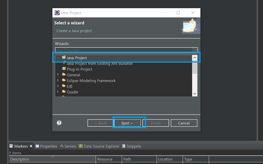[Java Proejct] -> [Next] 를 눌러줍니다