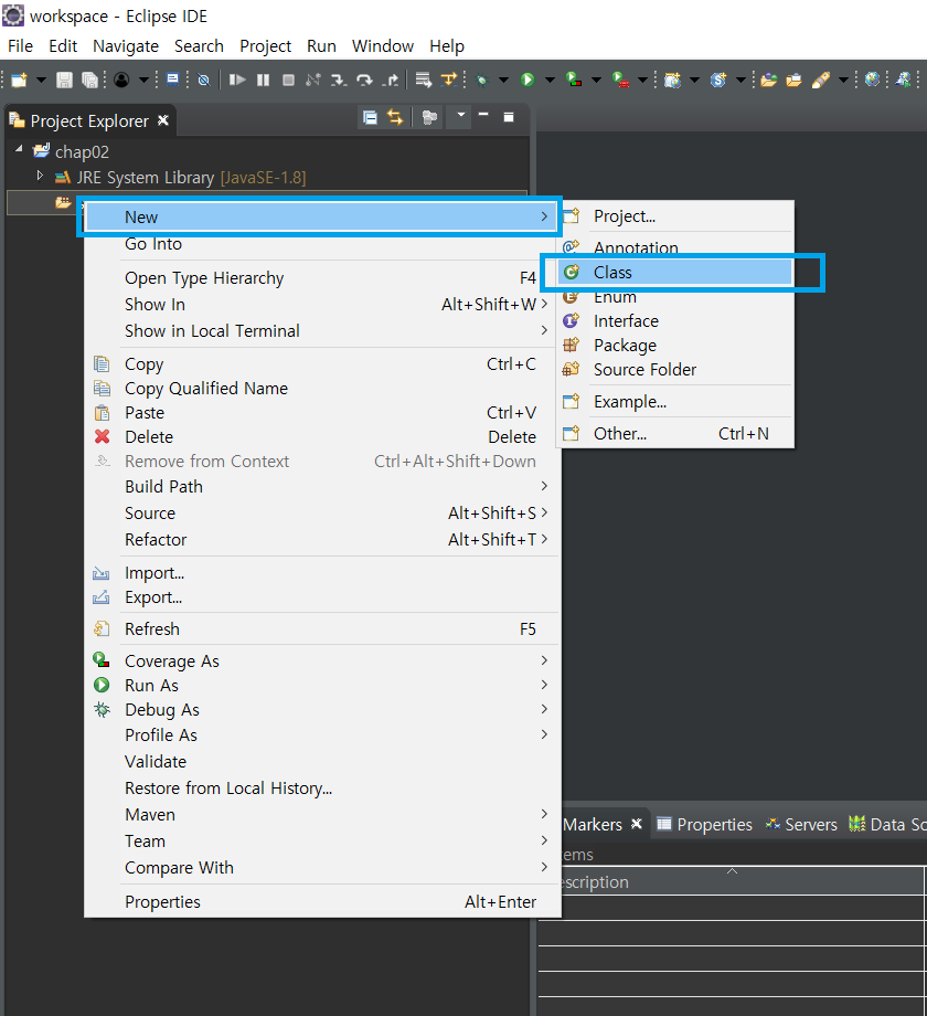 [src 폴더 우클릭] -> [New] -> [Class]를 누르시면 class를 새로 생성하는 창이 뜹니다.