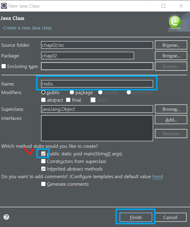 첫 번째 public static void main(String[] args)의 체크박스를 표시하게 될 경우, main 메서드가 같이 생성됩니다.