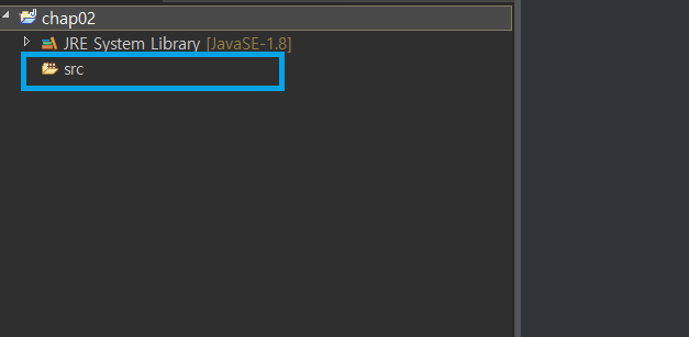 chap02는 자바프로젝트의 이름이며, 하위 디렉토리로 가시면 [src]가 보입니다. 이 src폴더는 'soource'의 약자로, 소스코드를 담는 파일입니다.